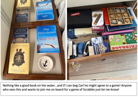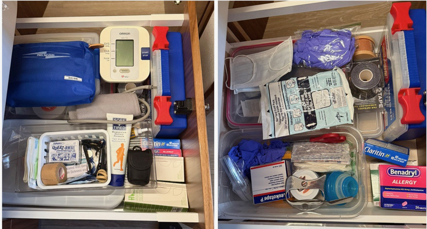 Everything is looking good for our plans to leave on May 1st. We are provisioning the boat this week. Started with clothing and assuring we have all basic first aide supplies as well as musculoskeletal first aide on board. What can I say, I’m a PT! Tomorrow we will start adding food and drink. Carl in the meantime has been constantly checking the engine room and everything mechanical on board. He is sanitizing our fresh water holding tanks, assuring all batteries are charging and working as they should be. He is constantly hosing down, buffing and organizing all things related to the running and maintenance of the boat.
