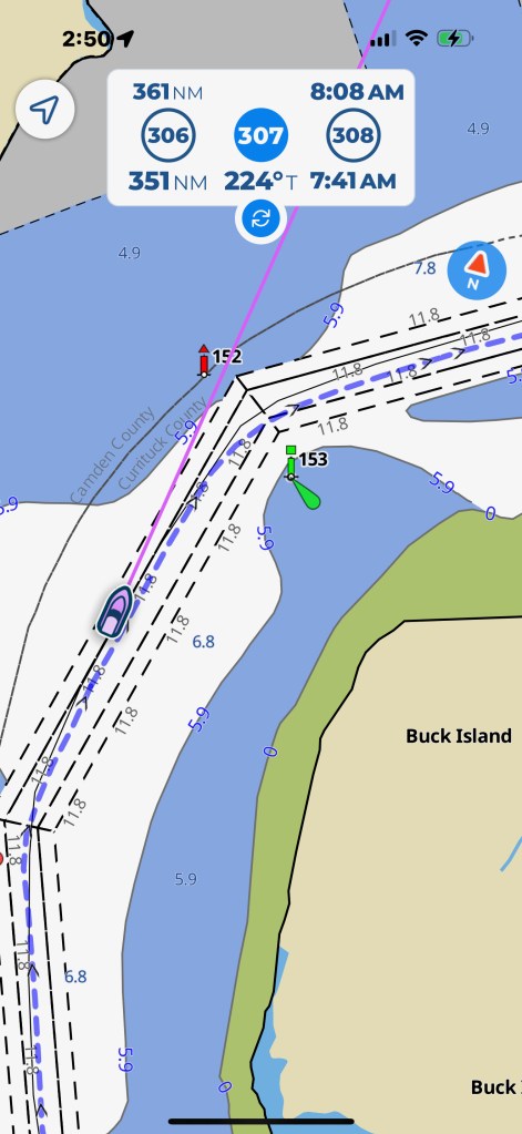 Always re-assuring when the marker you see on the map is where it should be on the water!…In some areas of the ICW, especially where it is shallow and common for shoals to form, the markers may be moved to assure travel in a deep enough channel.