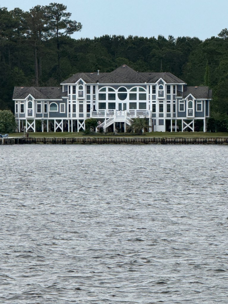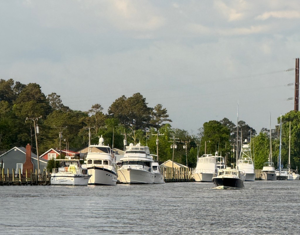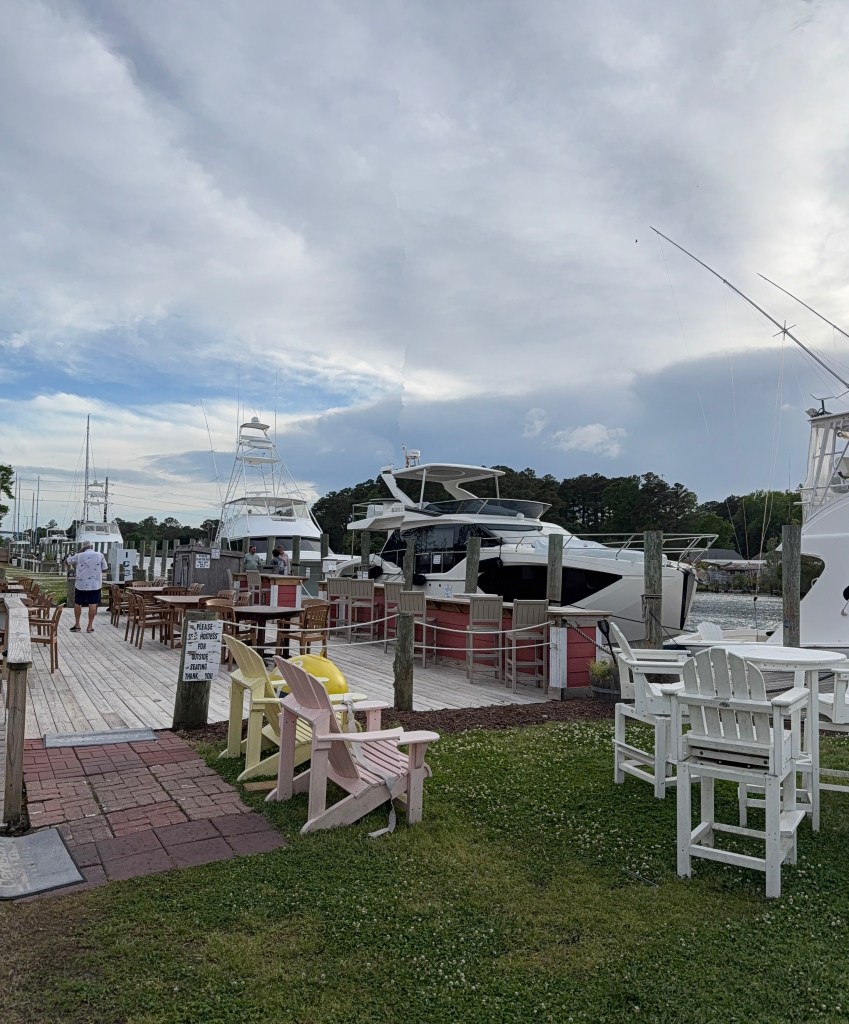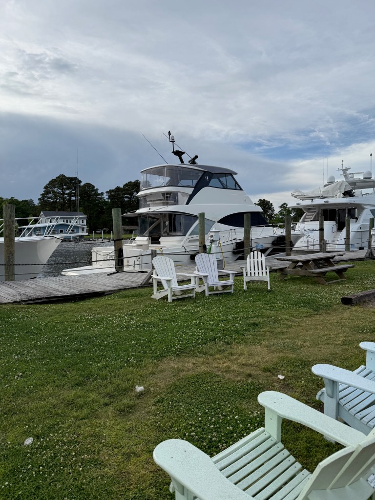 It was only another 3 hours to get to Coinjock from Belhaven, and with most of it on the ICW in areas where it was very wide, deep, and we were able to travel faster than is typical on the intracoastal. That is also because there were vast stretches of wilderness settings, vs homes on either side which meant we didn’t have to worry about creating a boat wake. The dolphins were there, but still not hanging around long enough for a pic! We passed a number of shrimp and crab boats with warm waves and friendly smiles. They all really do work hard for their money! (RIP Donna Summer). The contrast of fantastic homes with stretches of quiet nature was really nice, and mixed in between was the Pamlico Sound which was like boating through a washing machine and confirmed that the overall inside route on the ICW was the way to go today. Those reading this post who are familiar with Lake Winnipesaukee in NH (where we had a home and boated for years) could compare this to the Broads on a very busy boat day with lots of chop. Once we passed Pamlico and moved up the North River it returned to a very calm ride and we made our final circuitous passage up to the world famous Coinjock Restaurant and Marina in Coinjock, NC. It was so underwhelming, in a great way! Simple buildings, warm and friendly people working and many locals enjoying as well. Since it was a Monday, it was a slower day, which we were fine with. It is such a dichotomy looking at this humble marina and restaurant paired with yacht after yacht on a one thousand foot long dock that if needed will raft boats (tie one boat up to the boat next to the dock) to offer all who wish, an opportunity to experience this marina and restaurant. I would guess that better than 90% of those who come, stay for just the night before moving out towards their final destination. It provides a nice way to meet other boaters making the trip up north this time of year and compare routes, experiences, and exchange advice. Our boat buddy from RI (who we originally met in Fort Pierce) sure enough ended up docking right behind us! Super nice gentleman with lots of advice on this trip which he has done many times before north and south. Made us feel good that we have been able to keep up pace with him (not that this is a race or is it ;)…lots of testosterone between him and Carl, just saying!).