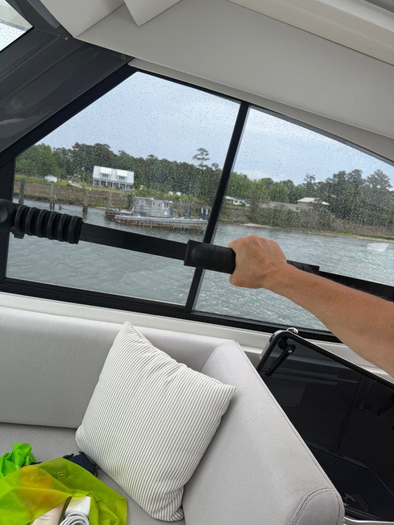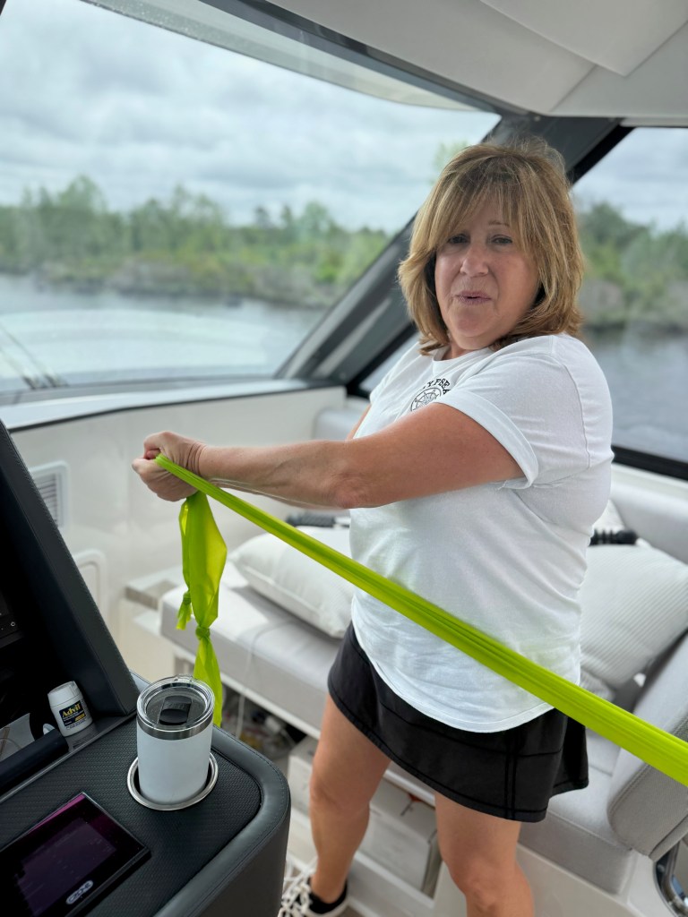 Hello All! We left Moorehead City in the rain with a fair amount of chop. Our initial plan was to enjoy a short run today and head to Belhaven, NC and relax, which unfortunately isn’t in our DNA. When we were less than an hour from The Belhaven Marina, close to noon, we contacted them and as fate would have it, it is literally the only marina we have ever booked at on Docwa (an online marina reservation service that virtually all marinas use these days, with some exceptions, namely Coinjock!) that allowed cancellations with a full refund 24 hours in advance. They readily accepted our cancellation and I believe we will still get a refund as well. I took the opportunity on a calm stretch of the ICW to do a resistive exercise band workout in the helm area.