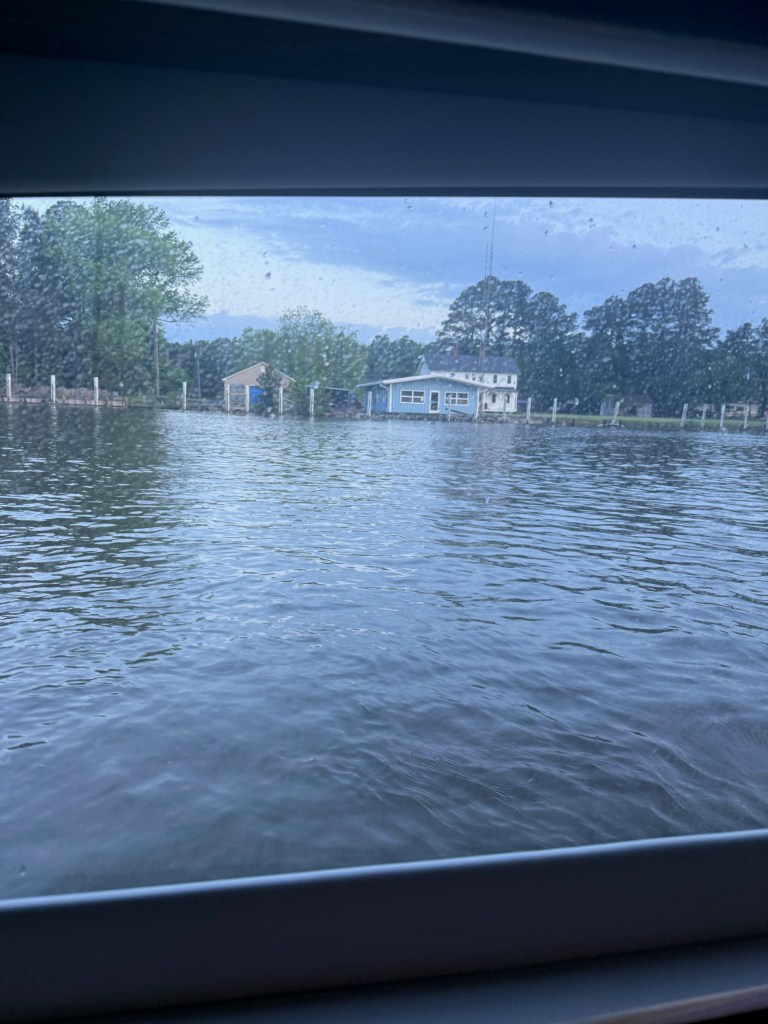 View out the berth (bedroom) across the river from Coinjock. Such a humble area and so welcoming to all the massive floating hardware that comes their way!