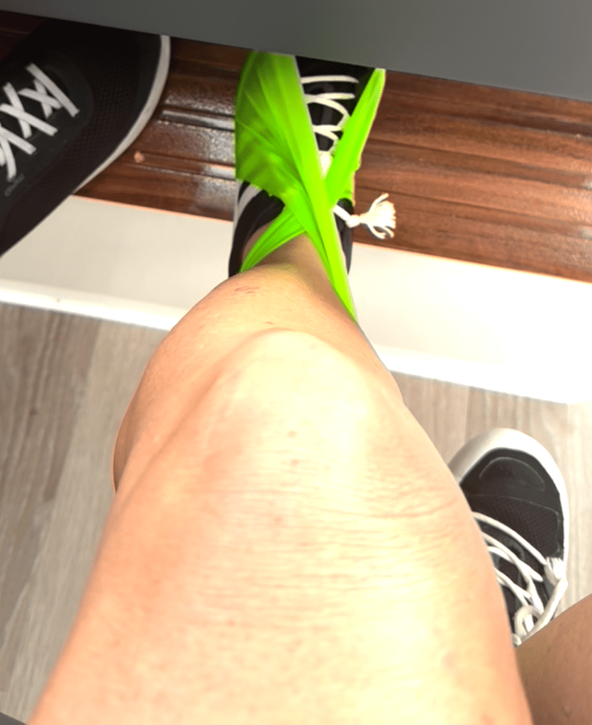 Hard to tell in this pic, getting a nice quad workout band is behnd the other ankle and doing a short arc from 90 degrees to about 65…less stress on the patella (knee cap) and easy to do when having to sit…also step in the band when sitting and do my biceps…